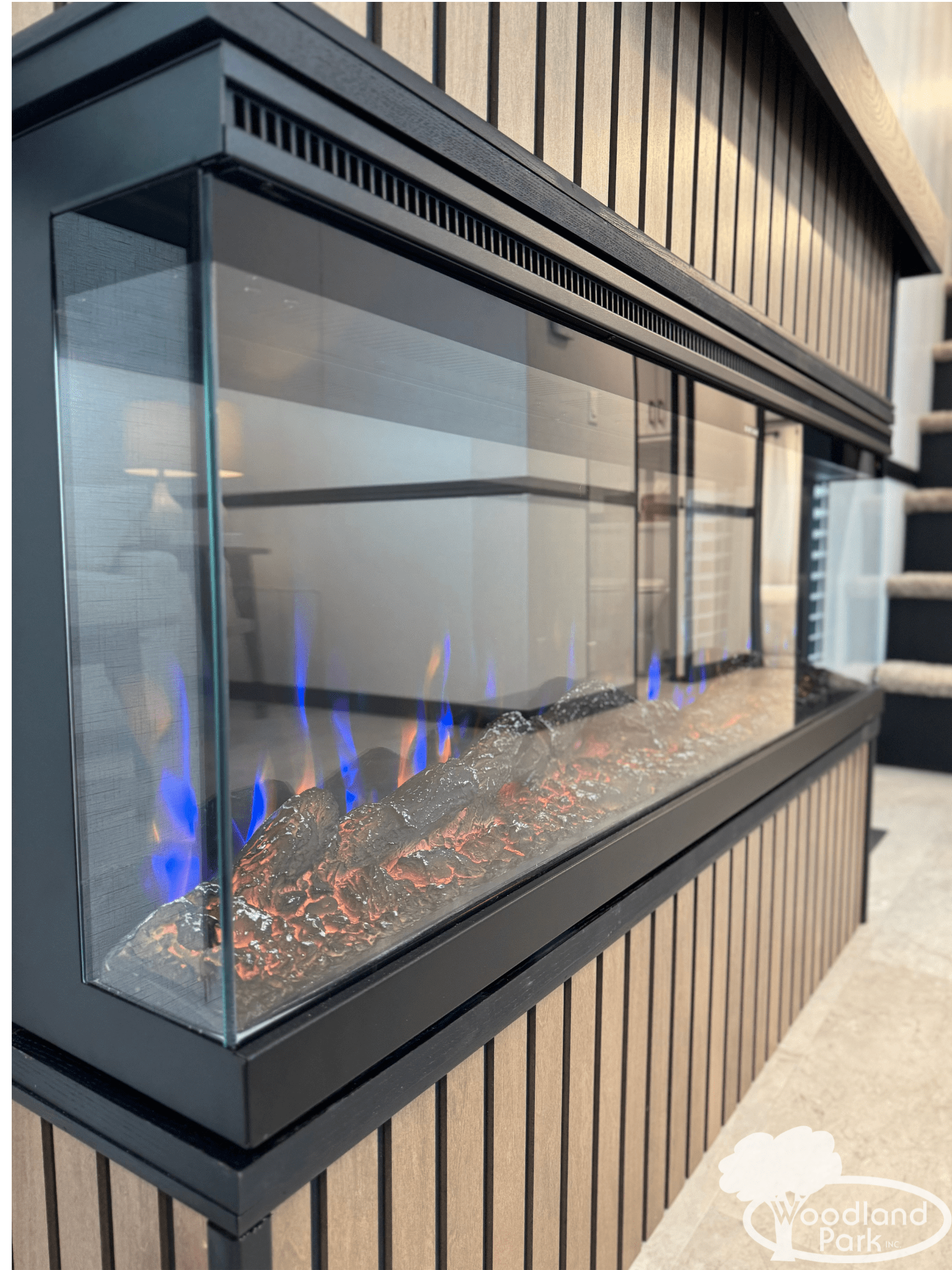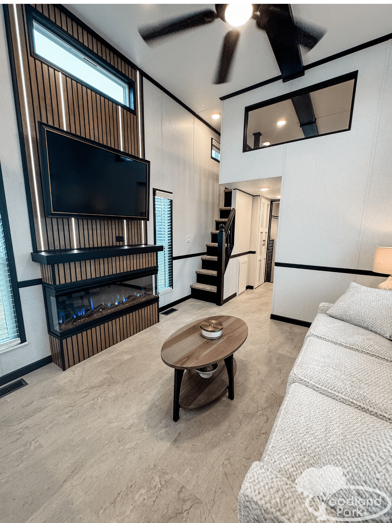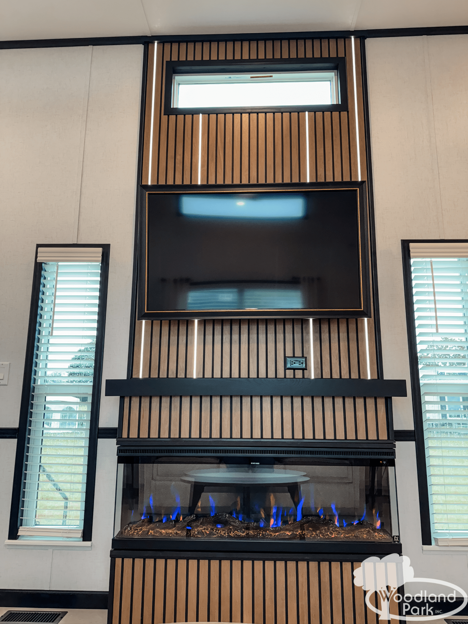 The living area features a striking acoustic slat accent wall entertainment center with a built-in fireplace, giving the home a warm modern aesthetic while adding depth and texture to the design. Toe-kick lighting throughout the cabinetry adds a subtle glow and elevated feel in the evenings.