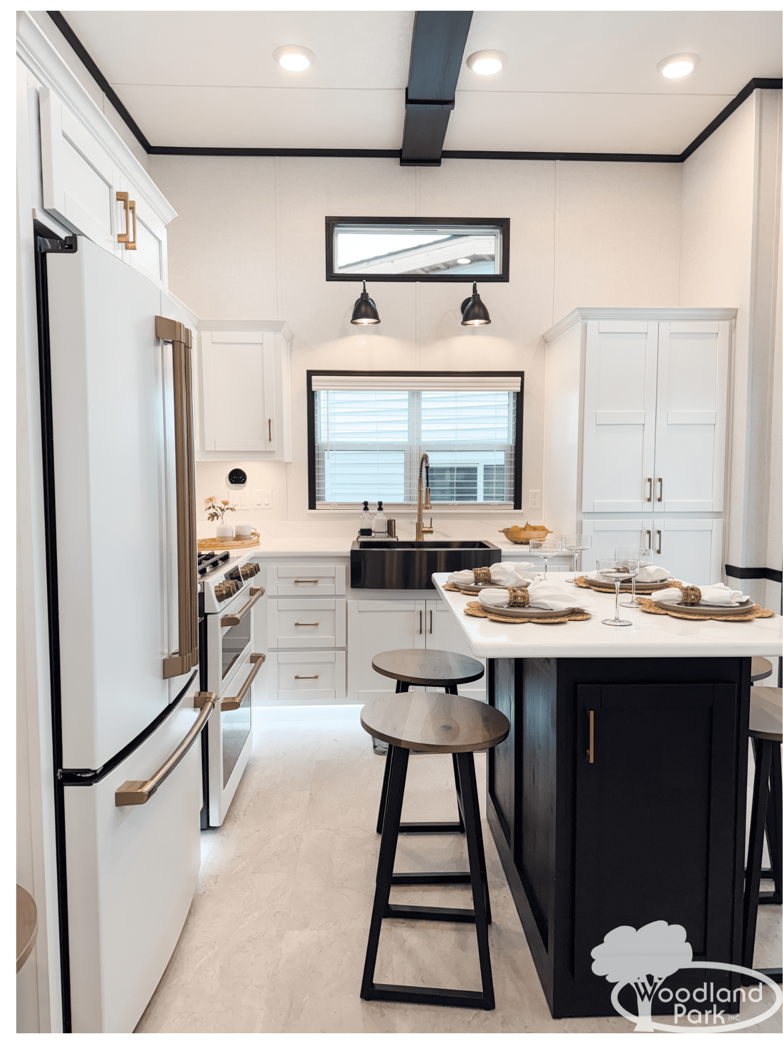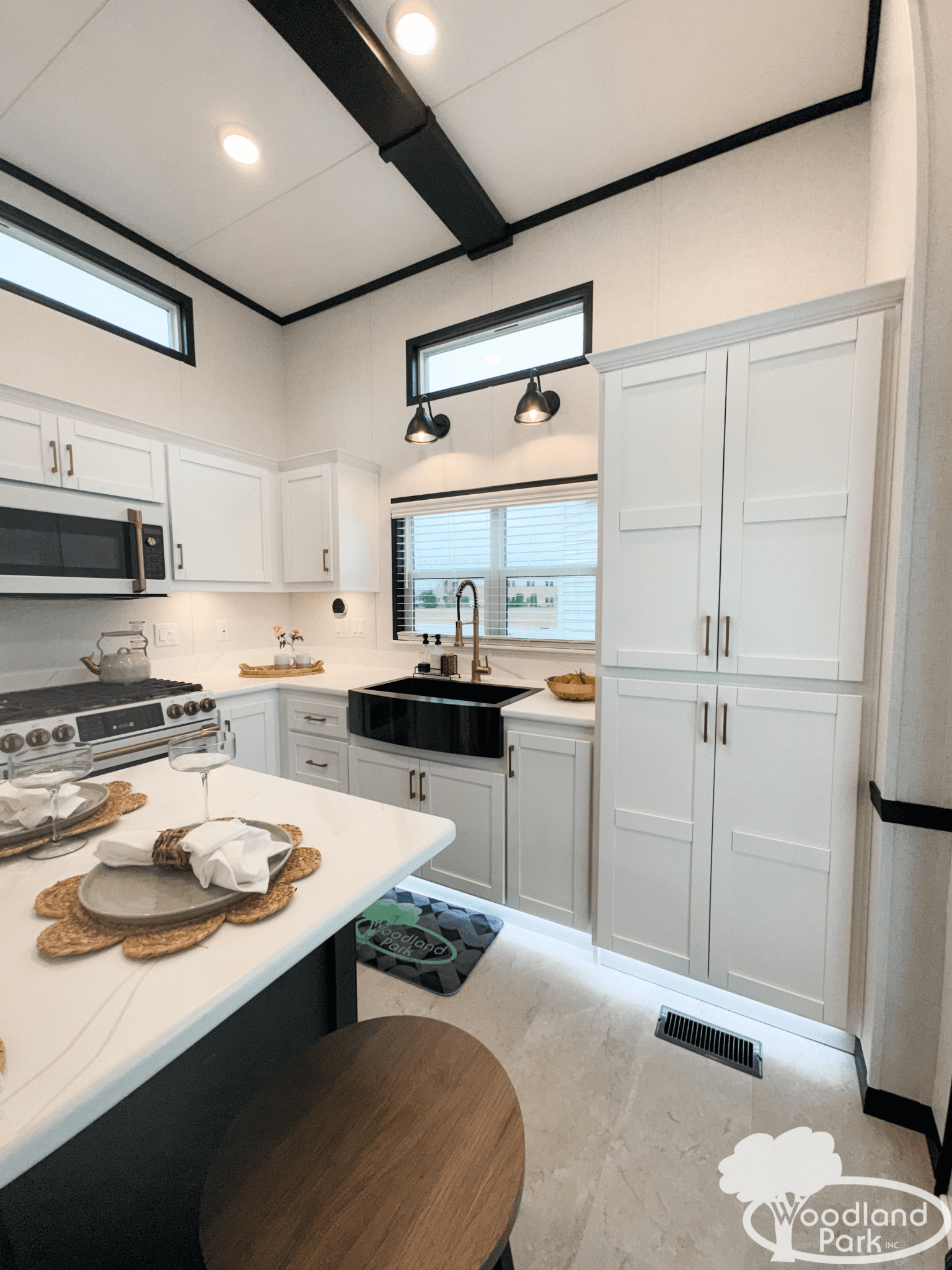 Inside you’ll find beautiful Corian countertops paired with high-end Café appliances, creating a kitchen that feels both upscale and functional. The black apron farmhouse sink, elegant cabinetry, and stylish lighting bring a clean modern look that perfectly complements the bright and open living space.