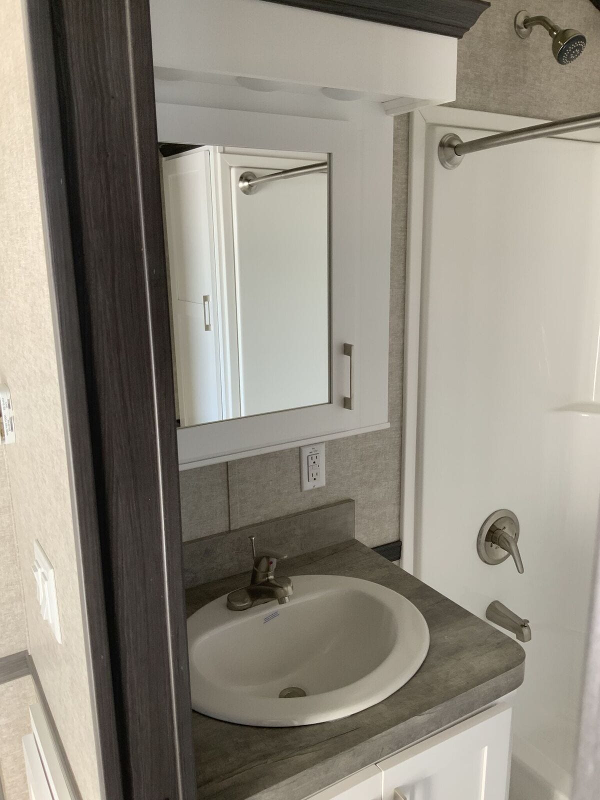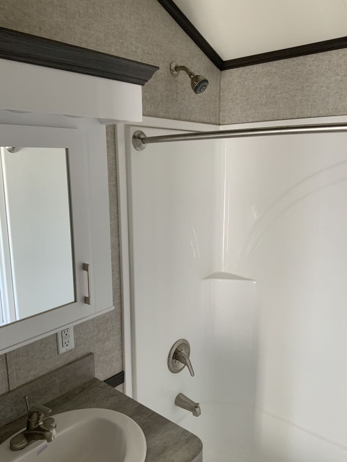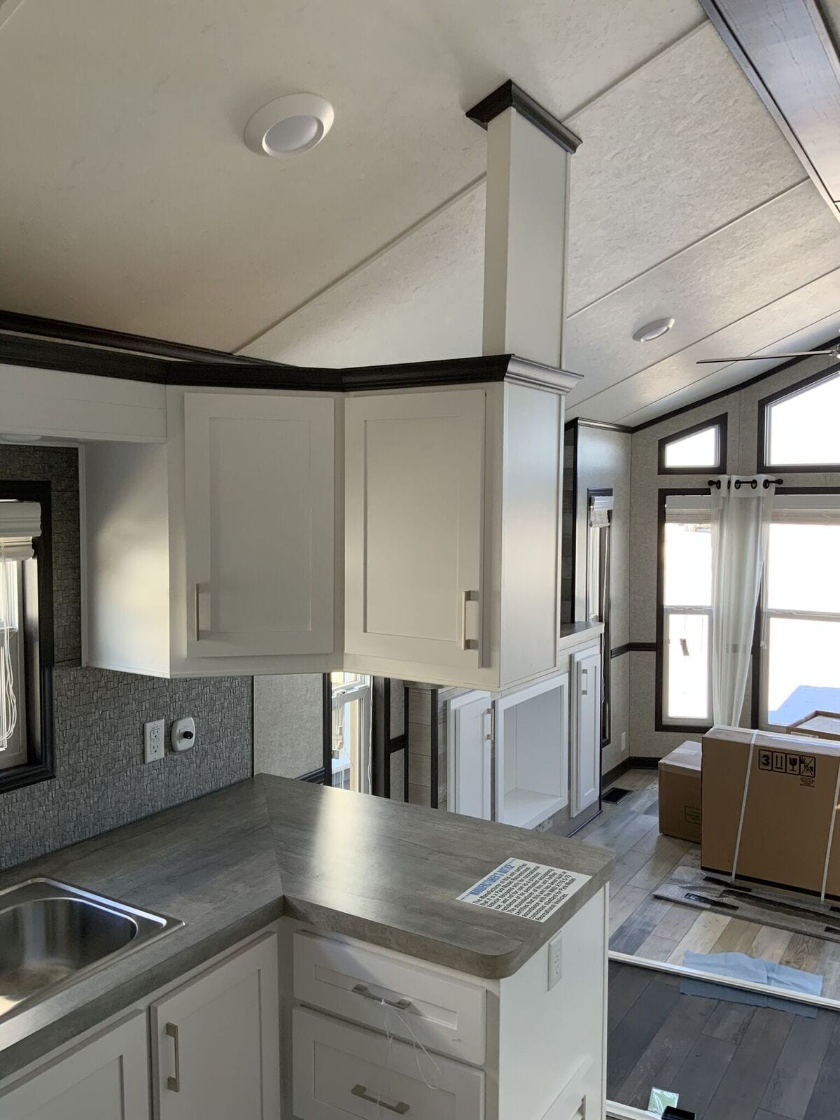 Contact SalesOur Woodland Park Timber Ridge Denali park model is a non-lofted luxury unit with a built-in entertainment center, central kitchen, and spacious layout. The first feature that will grab your attention when you approach this house is the huge bayed windows in front. These windows offer dramatic views while bringing plenty of natural light into the combined kitchen and living room featuring a pitched ceiling. This house also features a downstairs bedroom and a bathroom with extra storage space. Discover all the features we packed into 399 square feet and find out how incredibly roomy a home with such a small footprint can be. Request a customized quote on the Denali today.