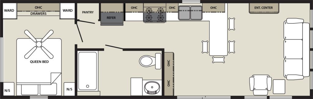 10" Extruded Steel I-Beam Chassis Detachable Hitch Corrosion Resistent Metal Underbelly 2"X6" Transverse Floor Joist 16" On Center 5/8" Tongue and Groove Plywood Decking Central Floor Ducted Heat R22 Floor Insulation 2"X4" Sidewall & Endwall Studs 16" On Center R11 Sidewall Insulation 3/8" OSB Wall Sheathing House Type Vapor Barrior On All Ext. Walls 90" Sidewall Height Residential Thermopane Single Hung Windows Rear Door W/Deadbolt and Screen (Where Applicable) Vinyl Siding W/Limited Lifetime Warranty Residential Truss Rafters R22 Roof Insulation 30 Year Warranty Asphalt ShinglesBATH AREA