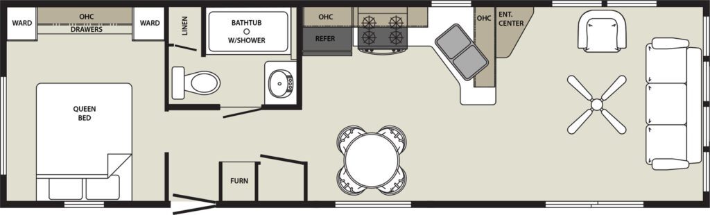 Premium Vinyl Siding Premium Upgrade Cabinetry Residential Upgrade Vinyl Flooring Recliner IPO Swivel Chair Black Appliances IPO White Metal Underbelly IPO Poly Underbelly House Type Rear Door Where Applicable 40,000 BTU RV Furnace IPO 56K 15,000 BTU Floor Duct A/C 5,000 BTU Loft A/C (Loft Models Only) 16 Gallon Gas/Electric WH IPO 20 Gallon Lft Up Queen Bed W/Storage Night Stand End Table Serta Upgrade Mattress Electric Fireplace 60" Bedspread Shower IPO Tub/Shower Shower Doors Tall Loft (Loft Models Only)Specifications