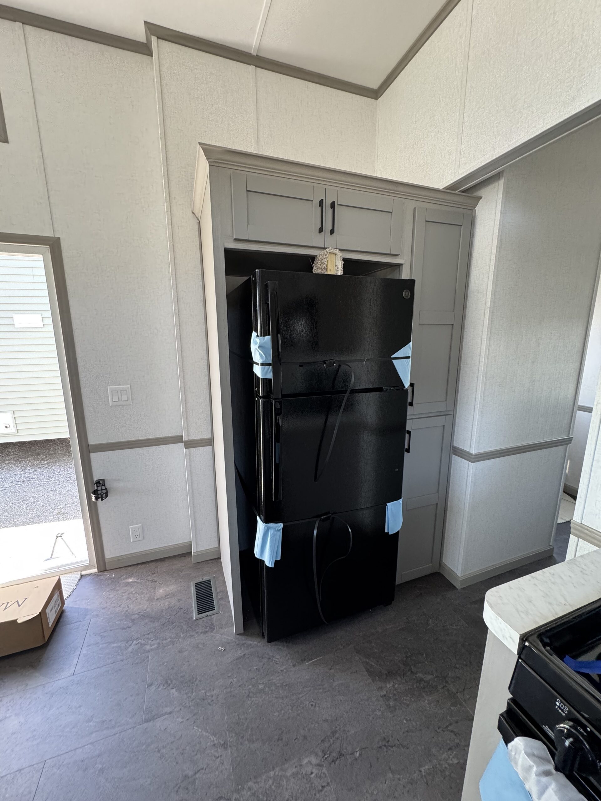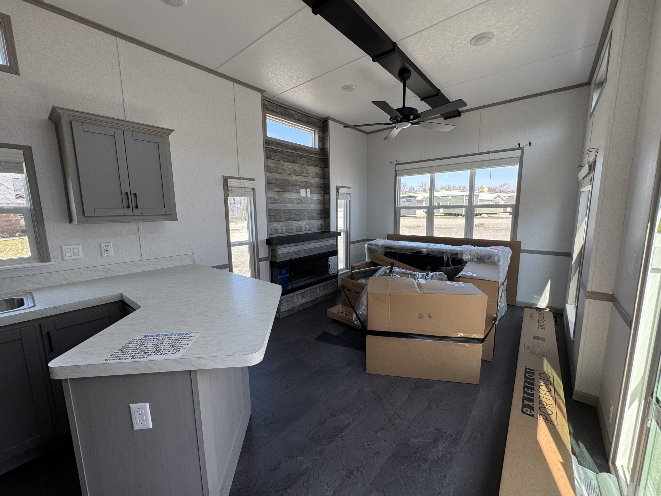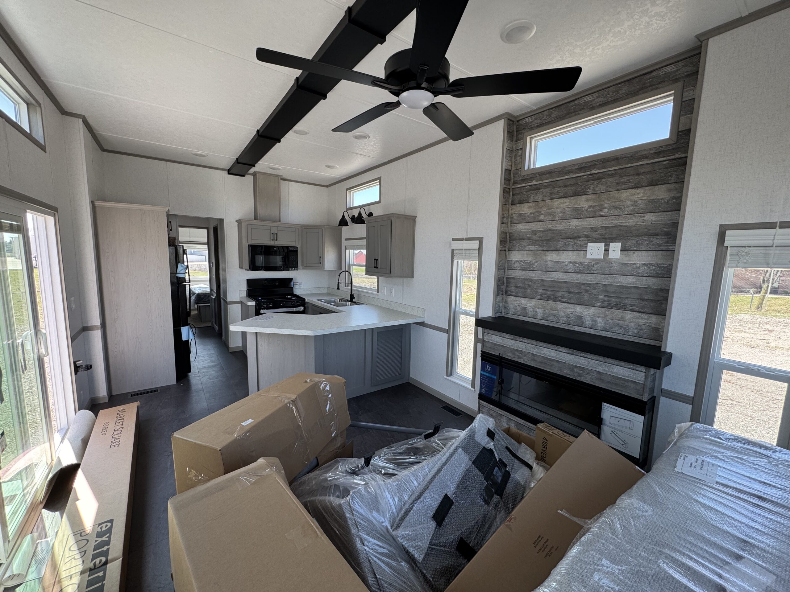 This model features a large, open living room with tons of natural light, highlighted by oversized windows, a feature wall fireplace, and exposed beam accents that give the space a modern, cozy feel. It comes fully furnished with a couch and recliner, making it move-in ready from day one.