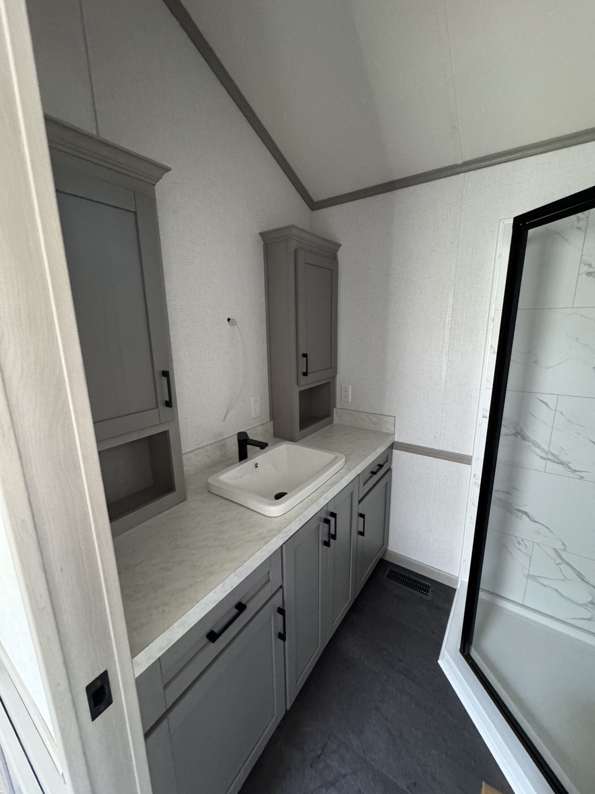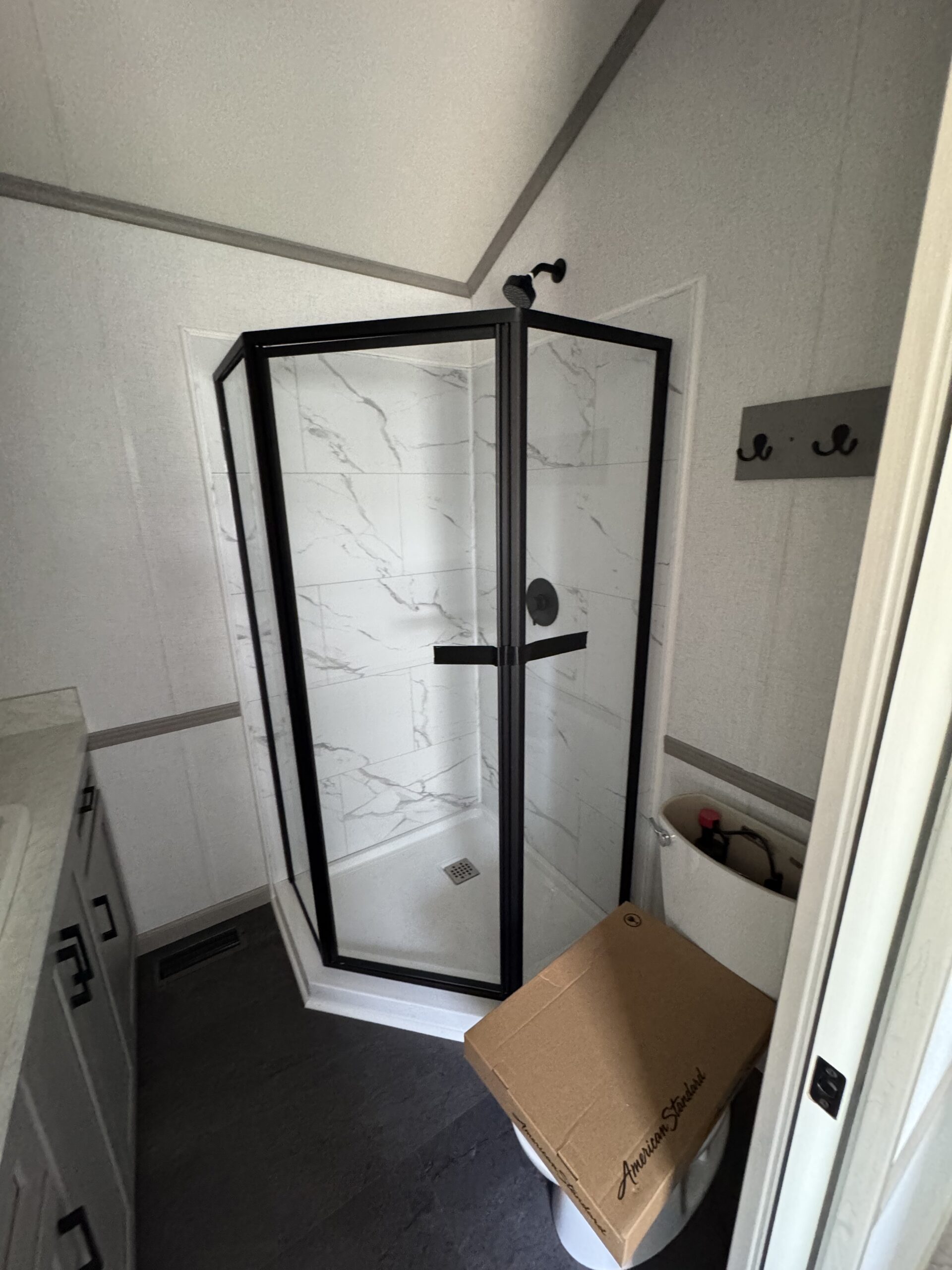 In the bathroom, you’ll find a beautiful upgraded walk-in shower with glass enclosure, modern fixtures, and plenty of storage with built-in cabinetry.