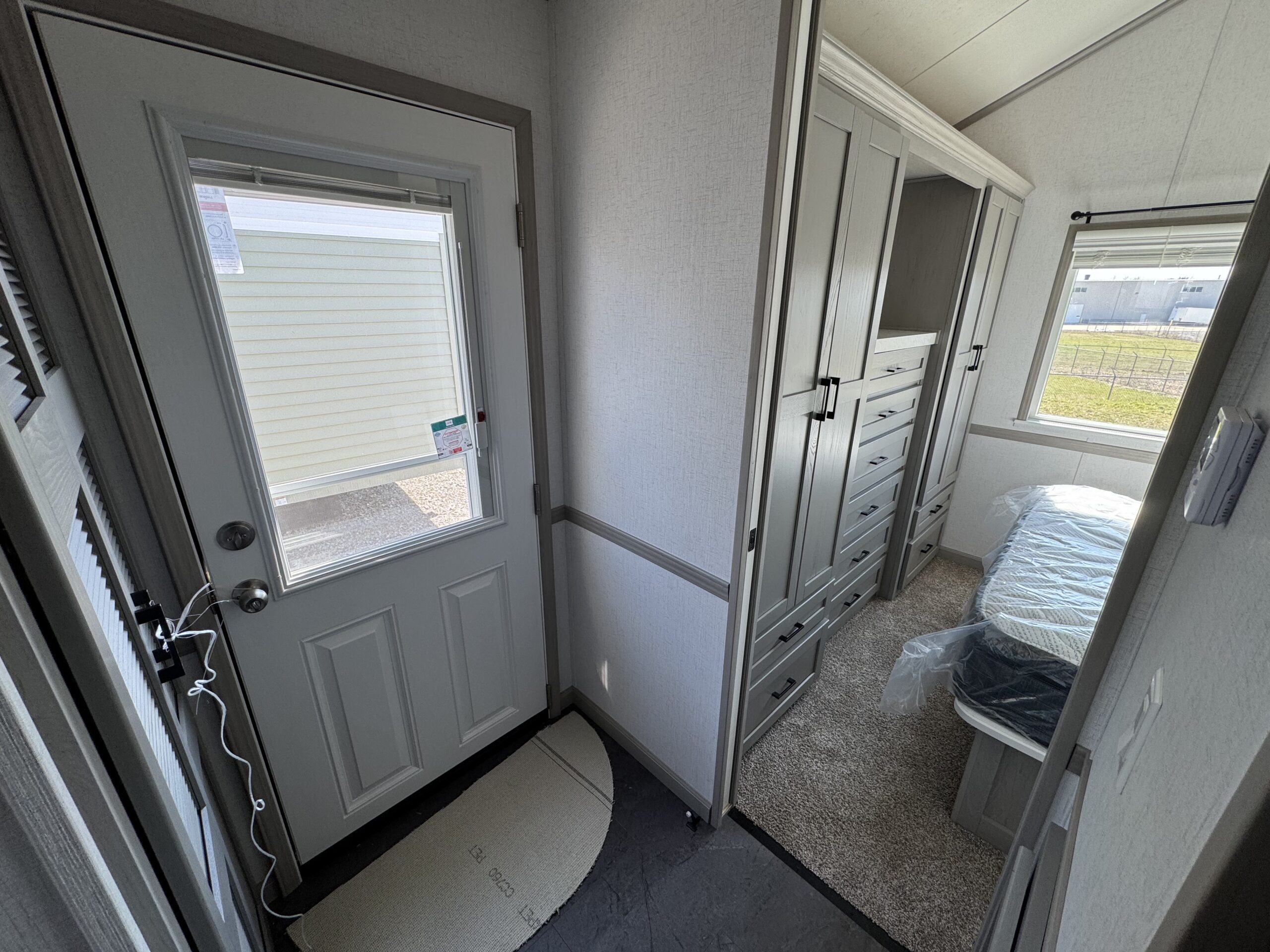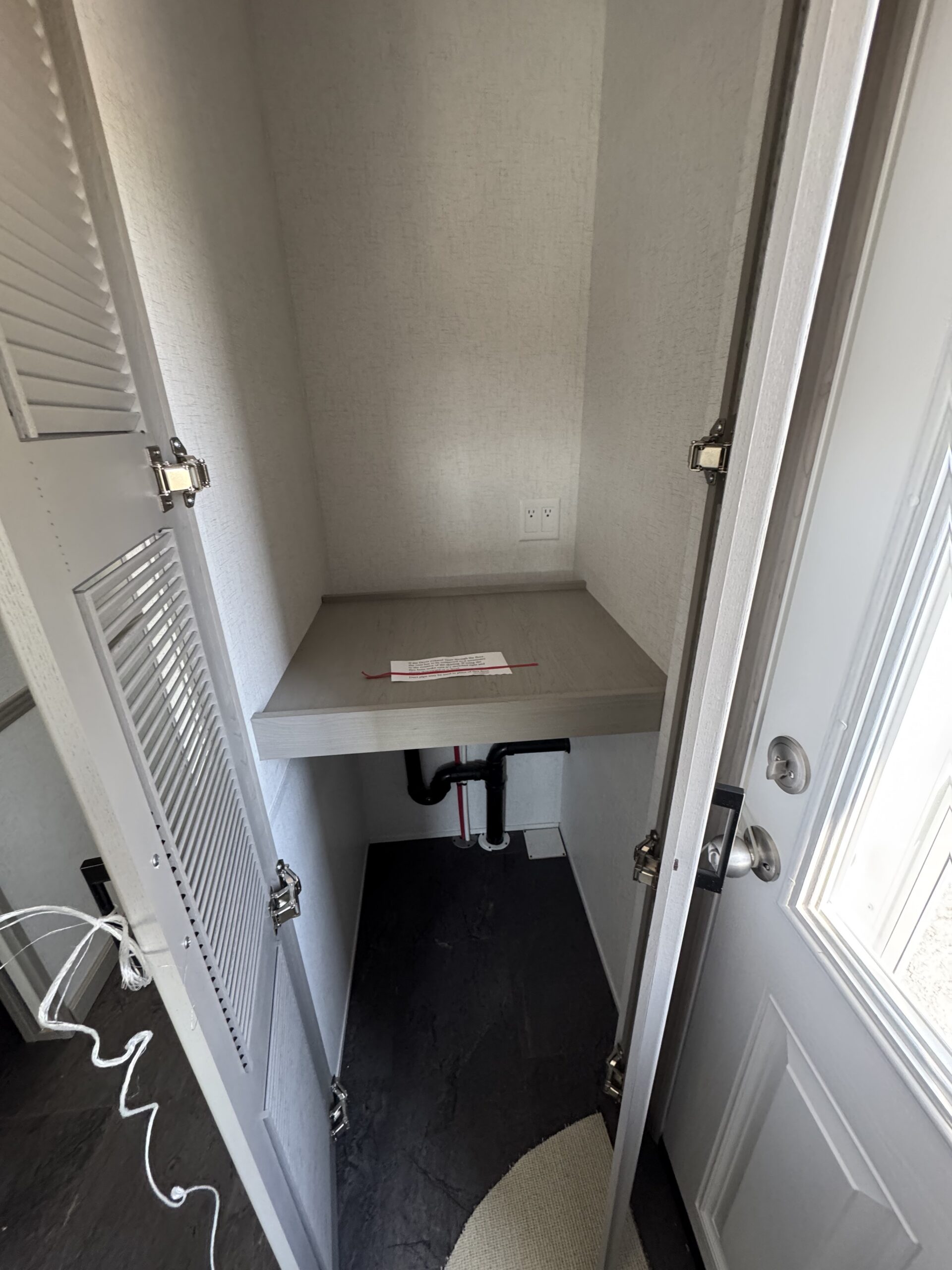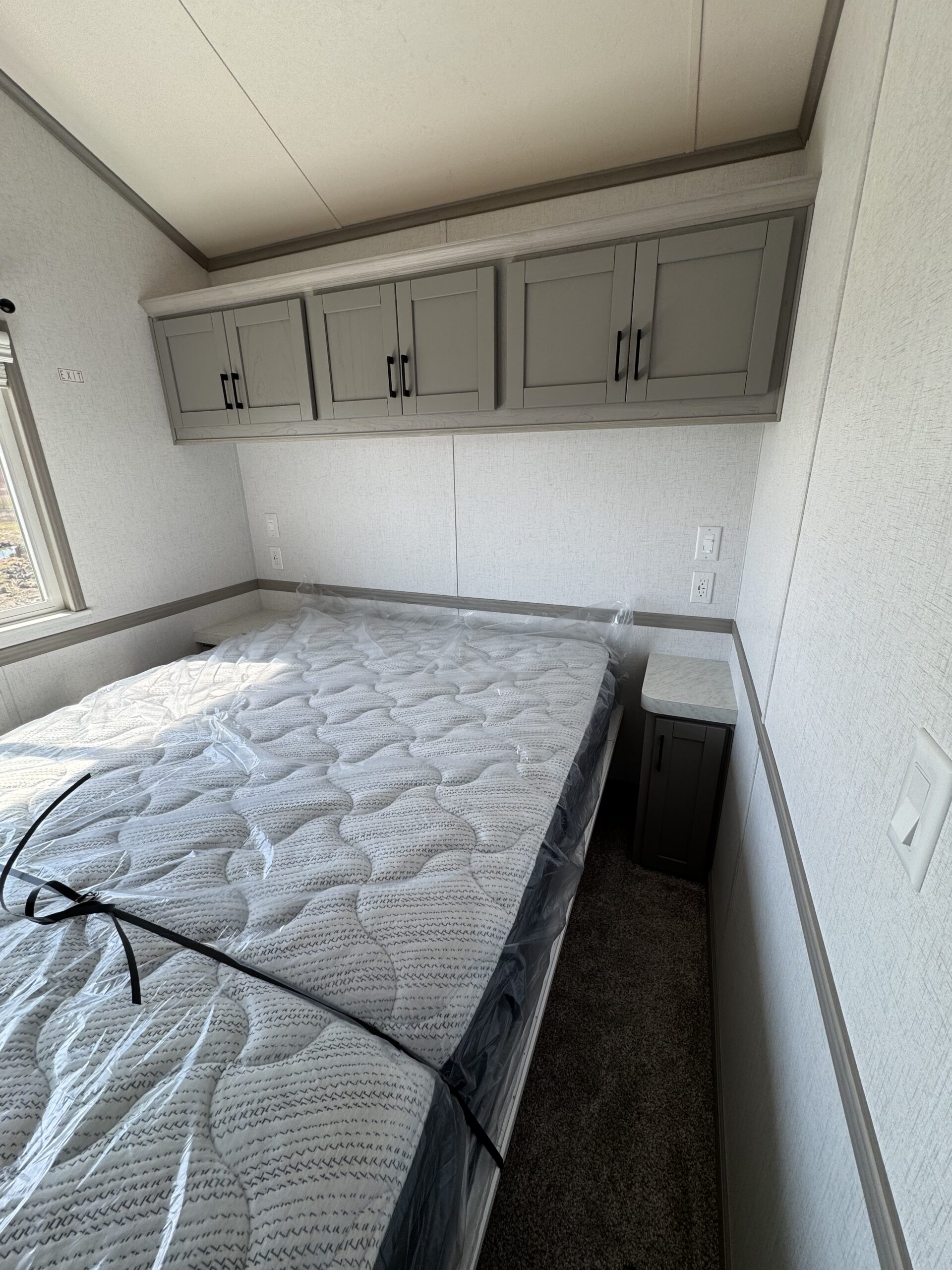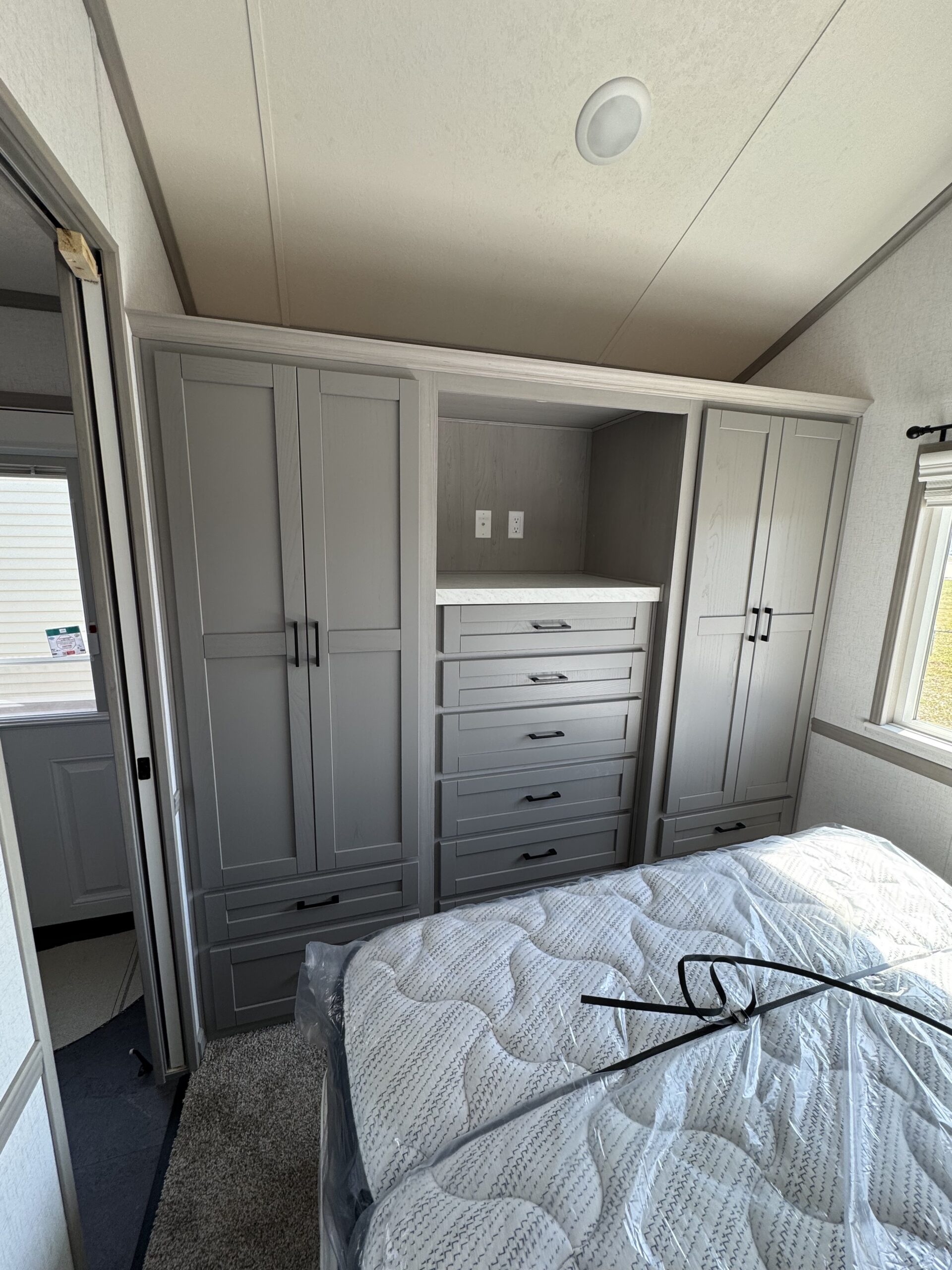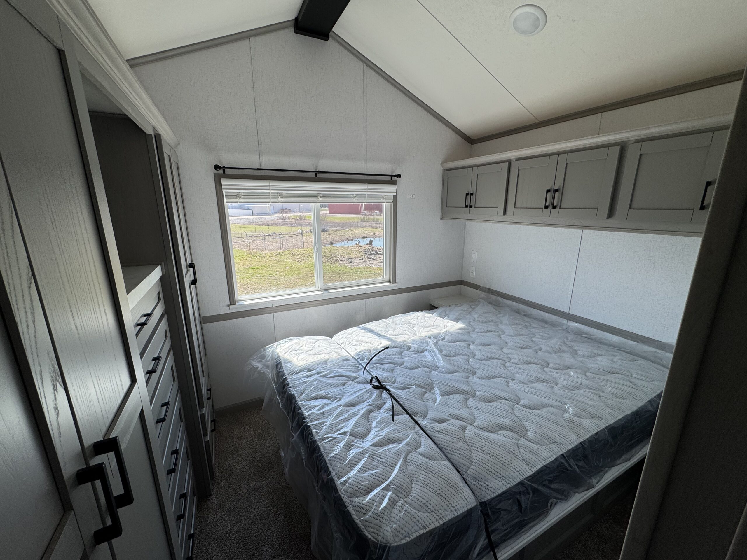 The bedroom offers a queen bed setup with built-in storage and wardrobe space, along with overhead cabinets for maximizing every inch. There is also dedicated washer/dryer space, giving you full-time living capability.