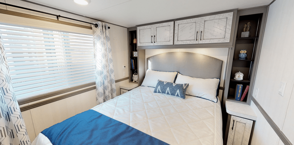 First of all, you should choose a park model home floor plan that includes both a loft and a downstairs bedroom, rather than just one or the other.